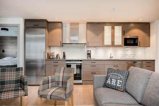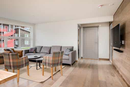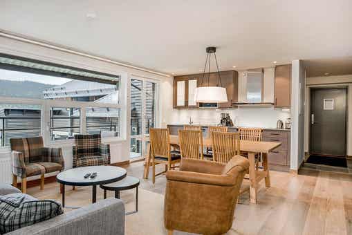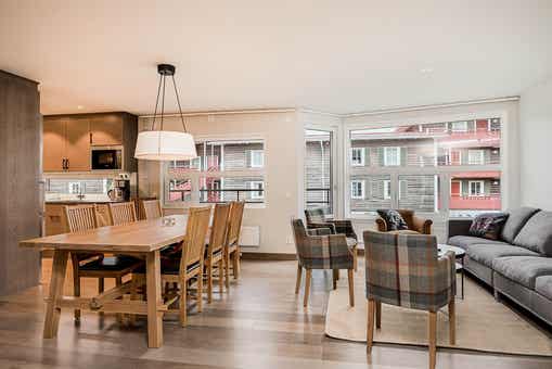 Wohnzimmer mit Küche. TV, zwei Trockenschränke, geeignet für Skibekleidung und Skischuhe, Waschmaschine, Bügeleisen und Bügelbrett, Haartrockner, Balkon mit Gartenmöbeln, Verschließbarer Skiraum, Aufzug im Haus, 1 Parkplatz mit Strom für Motorvorwärmer, Zugang zu gemeinsame Ladestation für Elektroautos mit Ausgang Typ 2 gegen Gebühr, Bei der Buchung von mindestens sieben Nächten ist auch eine einfachere Reinigung während des Aufenthalts inklusive.