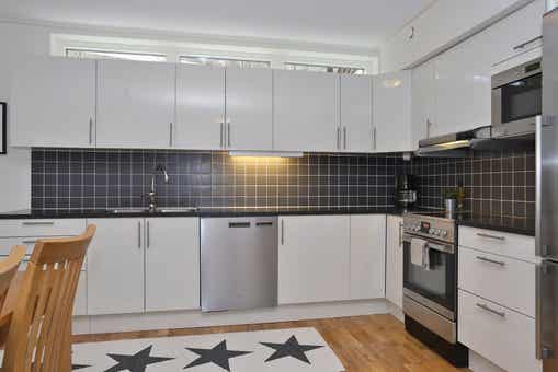 Küche enthält Herd mit Ofen, Mikrowelle, Kühlschrank und Gefrierschrank, Spülmaschine.