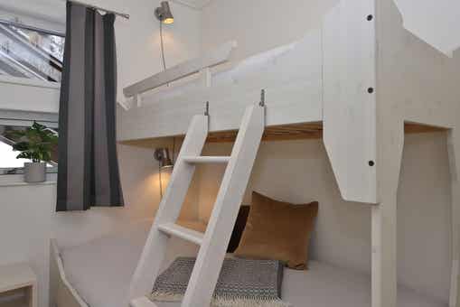Schlafzimmer 1 = 1 Doppelbett, 180 cm breit. Schlafzimmer 2 = 1 Etagenbett, bei dem das untere Bett 120 cm und das obere Bett 80 cm breit ist. Schlafzimmer 3 = 1 Etagenbett, bei dem das untere und obere Bett 80 cm breit sind.